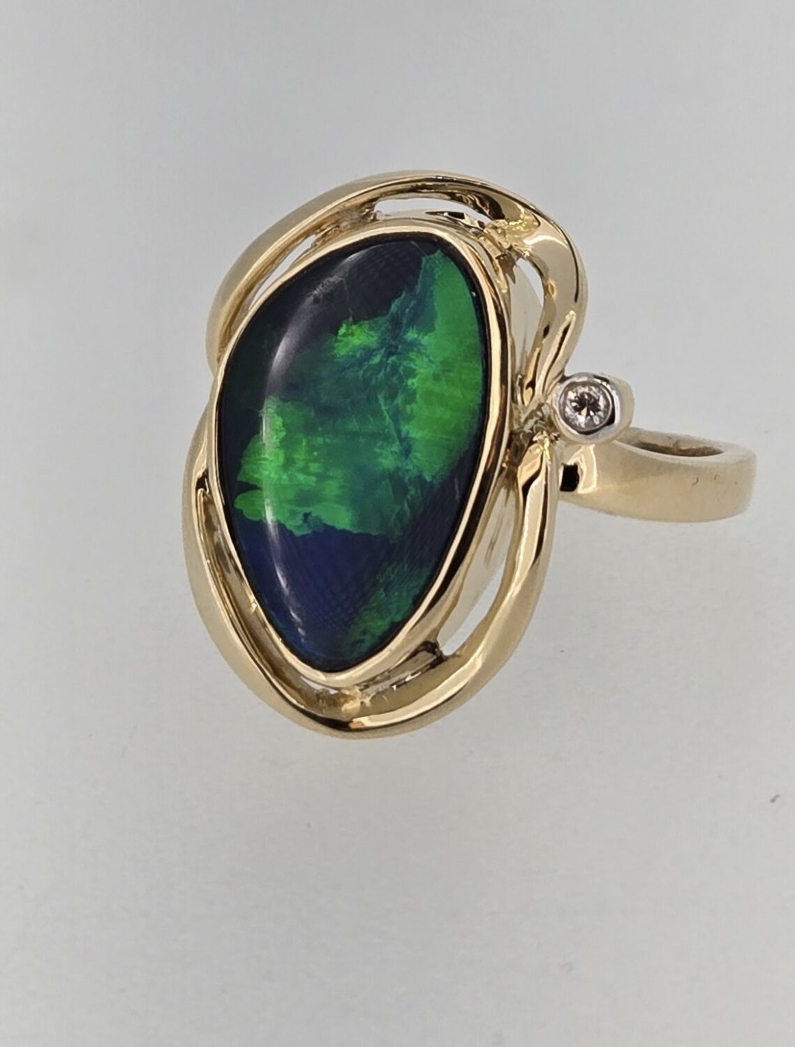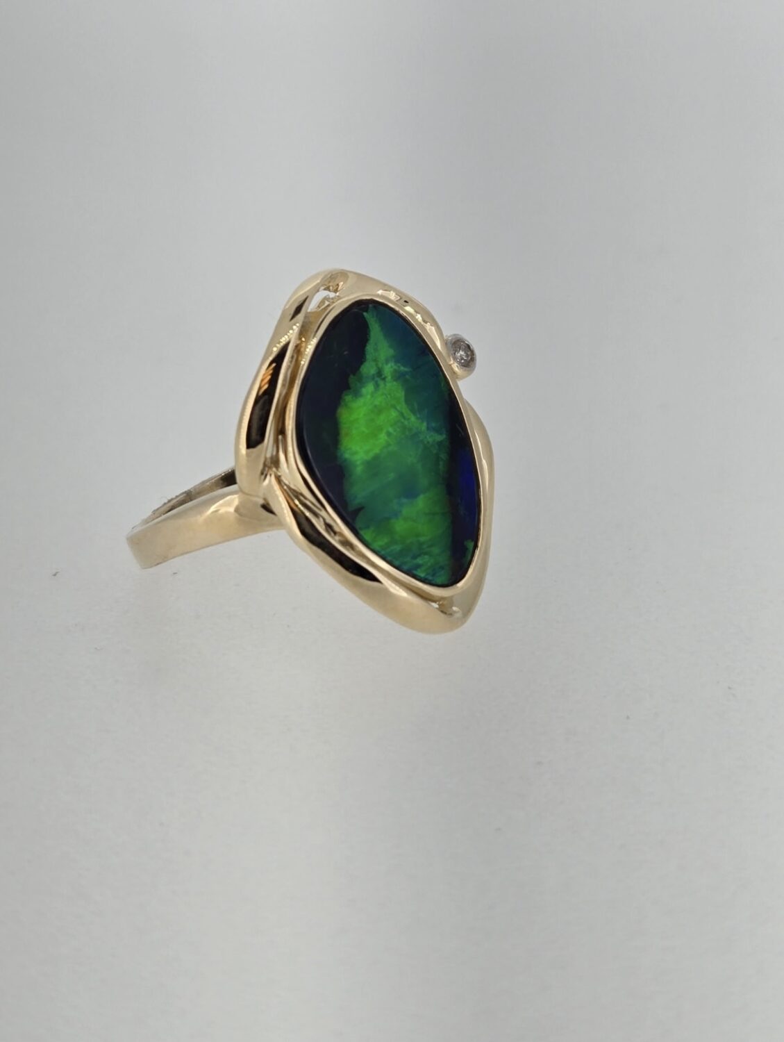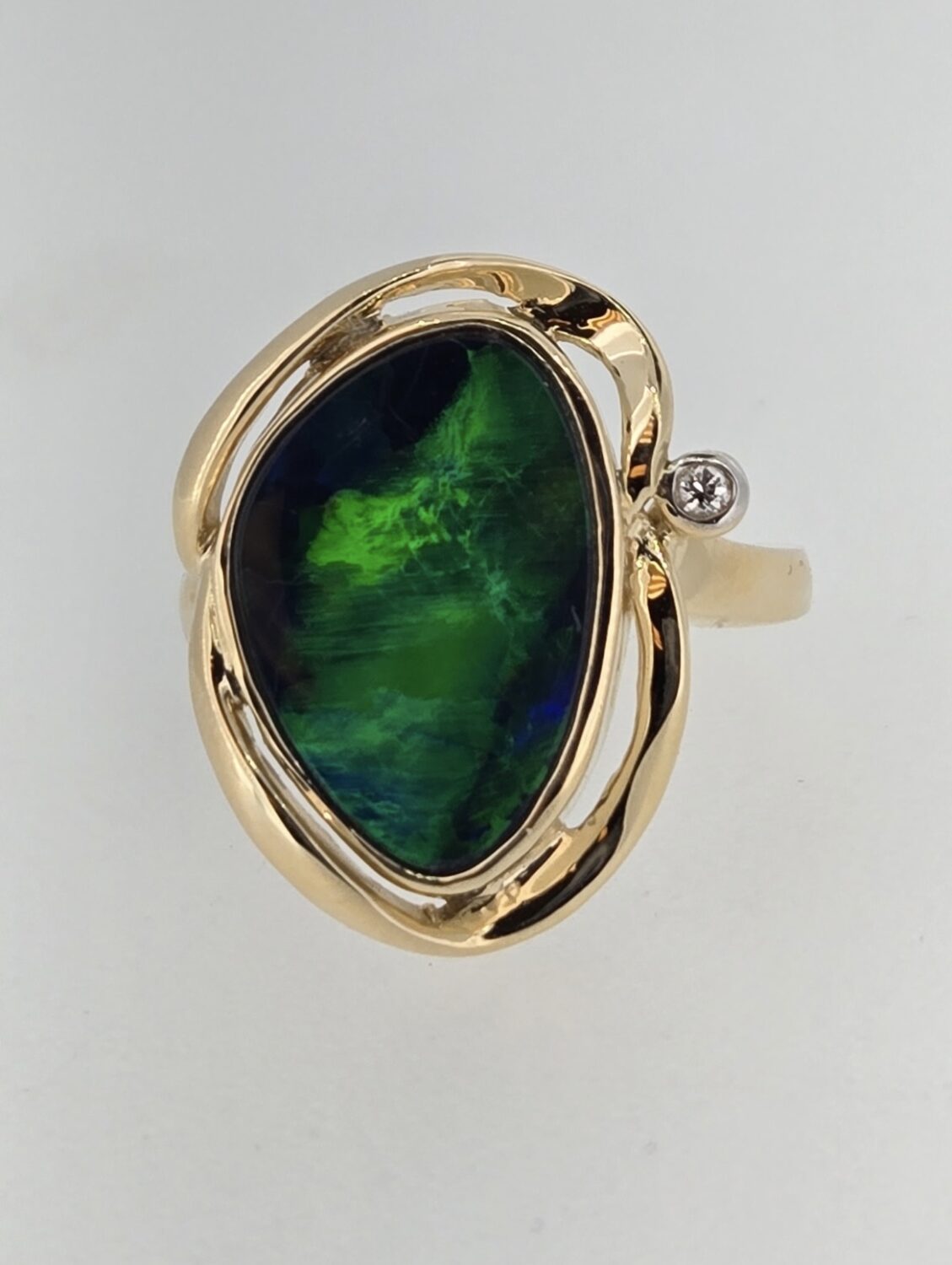 Spectacular ring featuring a large green and blue opal with incredible light play surrounded by a gold abstract halo and a singular diamond set on the halo.